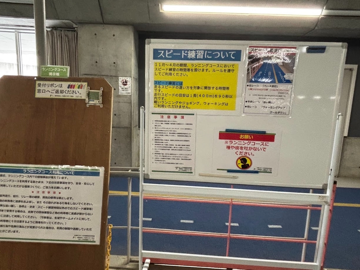 その他通常時間は、スピード練習は禁止です(1周90秒以内(キロ3:45ペース)) - 1周400mです。レーン出入口を基準に100mごとに張り紙がしてあります。